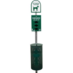 Dog waste station with a trash can allows easy disposal to help keep areas free from dog waste. Powder-coated aluminum is rustproof for lasting outdoor use. Pet sign is displayed at the top of the unit for a friendly way to encourage use. Dispenser is designed for use with Tatco dog waste bags (not included). Dog waste station is perfect for parks, residential complexes, office landscapes and more.